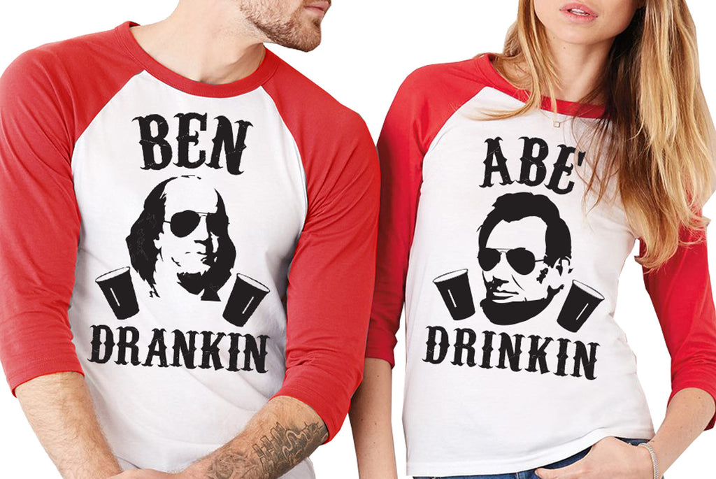 "BEN DRANKIN" or "ABE DRINKIN" Unisex 4th of July Red Baseball Tees with Black Print