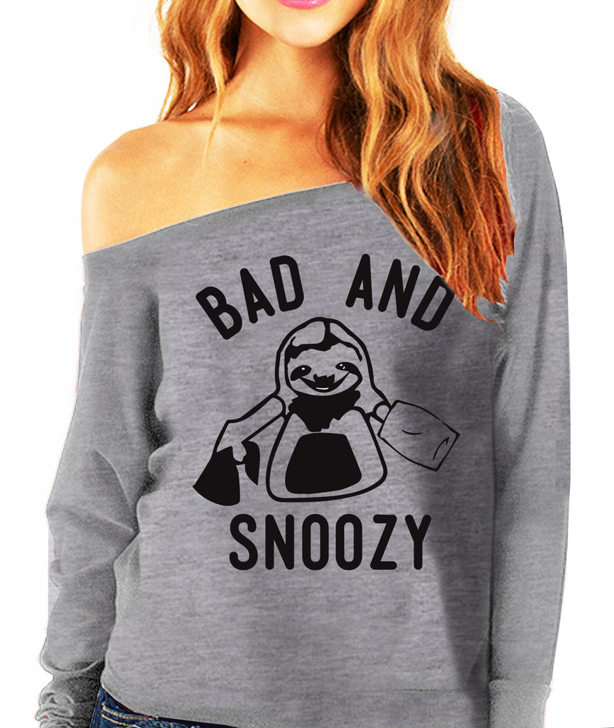 "BAD & SNOOZY" Sloth Heather Gray Off-Shoulder Sweatshirt