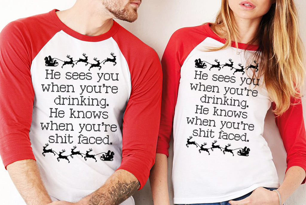 "HE SEE'S YOU WHEN YOU'RE DRINKING, HE KNOWS WHEN YOU'RE SHIT FACED" Unisex Christmas Red Baseball Tee