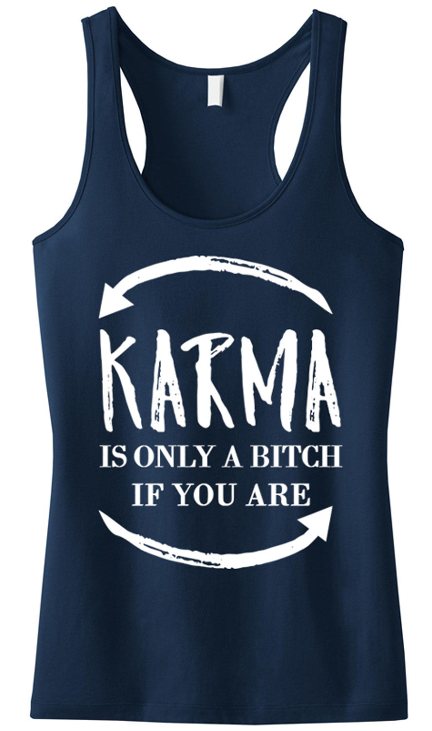 "KARMA is only a bitch if you are" Navy Blue Racerback Tank Top with White Print