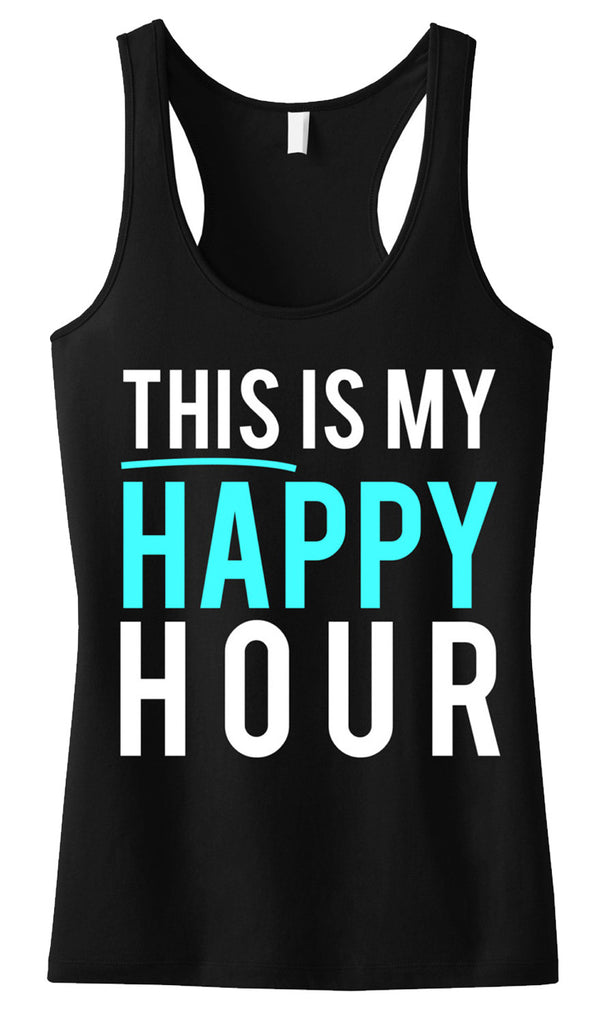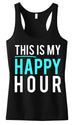 "This Is My Happy Hour" Hot Pink Print: Black with Teal Racerback Pictured